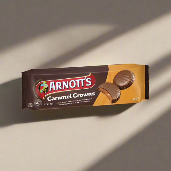 Experience indulgence with Arnott's Caramel Crowns, featuring a luxurious caramel filling and a rich coating of real chocolate made from the finest cocoa and Australian milk products. Satisfy your cravings with these delectable biscuits!