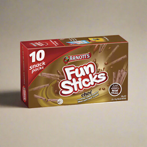 Get ready to snack on some fun with Arnott's Fun Choc Stick biscuits! These tasty rolled wafers are filled with a sweet chocolate cream and come in a pack of 10 snack-sized packs, each filled with a handful of bite-sized biscuit sticks for everyone to grab and enjoy.